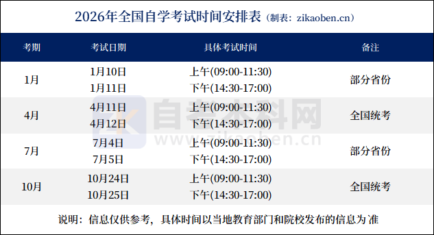 | 浙江 | 2026年1月中旬 | 1月中旬 | 4月11日、12日 | 浙江自考报名入口 | 暂未公布 |